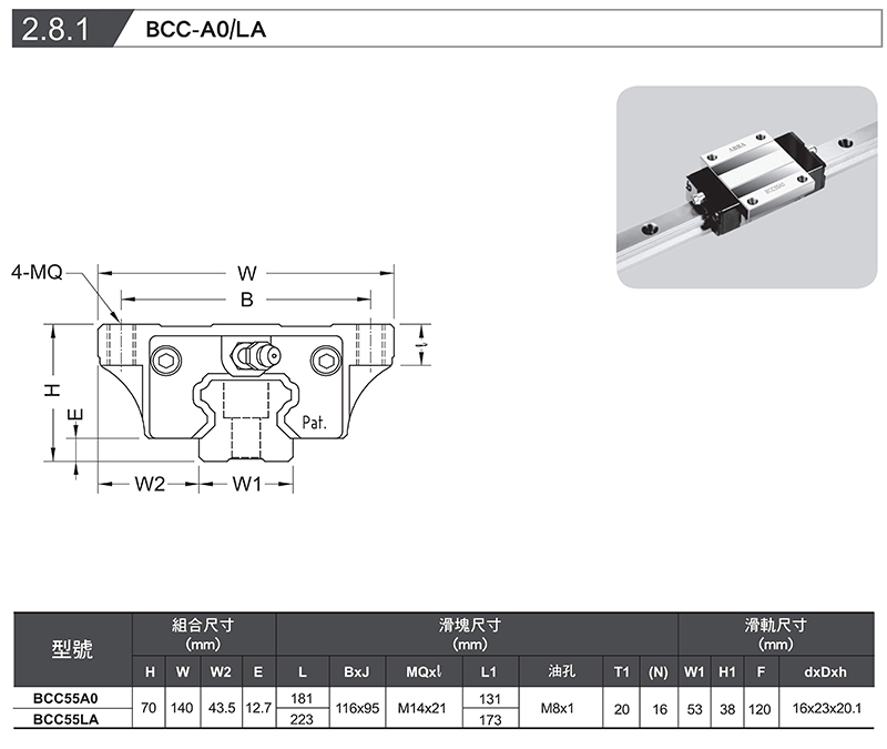 | BCC55A0 | H=70、W=140、W2=43.5、E=12.7 | L=181、BxJ=116×95、MxJ=M14×21、L1=131 | T1=20、W1=16、H1=38、F=120、dxh=16×23×20.1 |